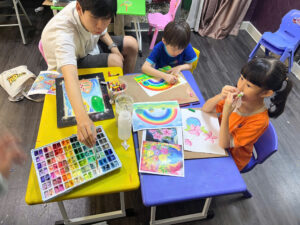 Giáo viên luôn đứng cạnh quan sát và hướng dẫn từng bước nhỏ. Chỉ cần học viên hơi lúng túng khi pha màu hoặc đặt nét cọ, giáo viên sẽ nhẹ nhàng hỗ trợ ngay lập tức.